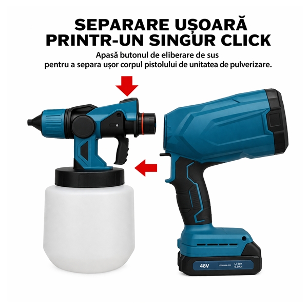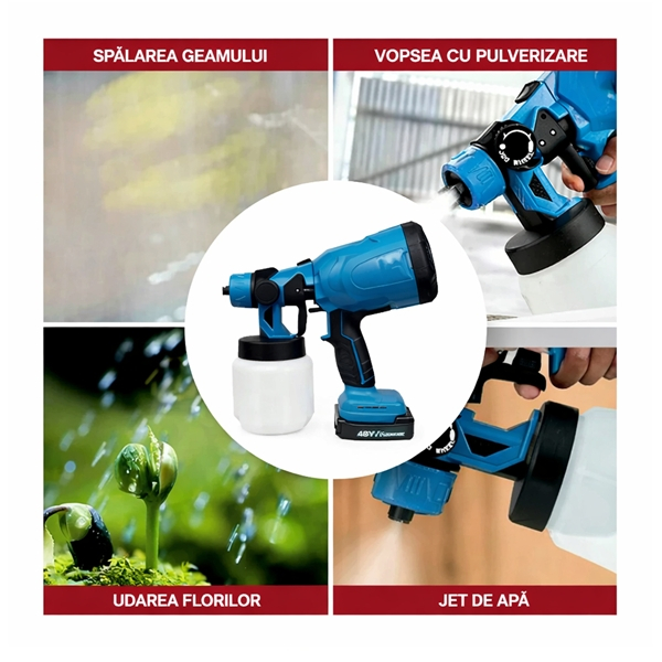 Pistol de vopsit electric cu acumulator 48V, DEPOX®, rezervor 1000 ml, 1200 ml/min, 3 moduri pulverizare