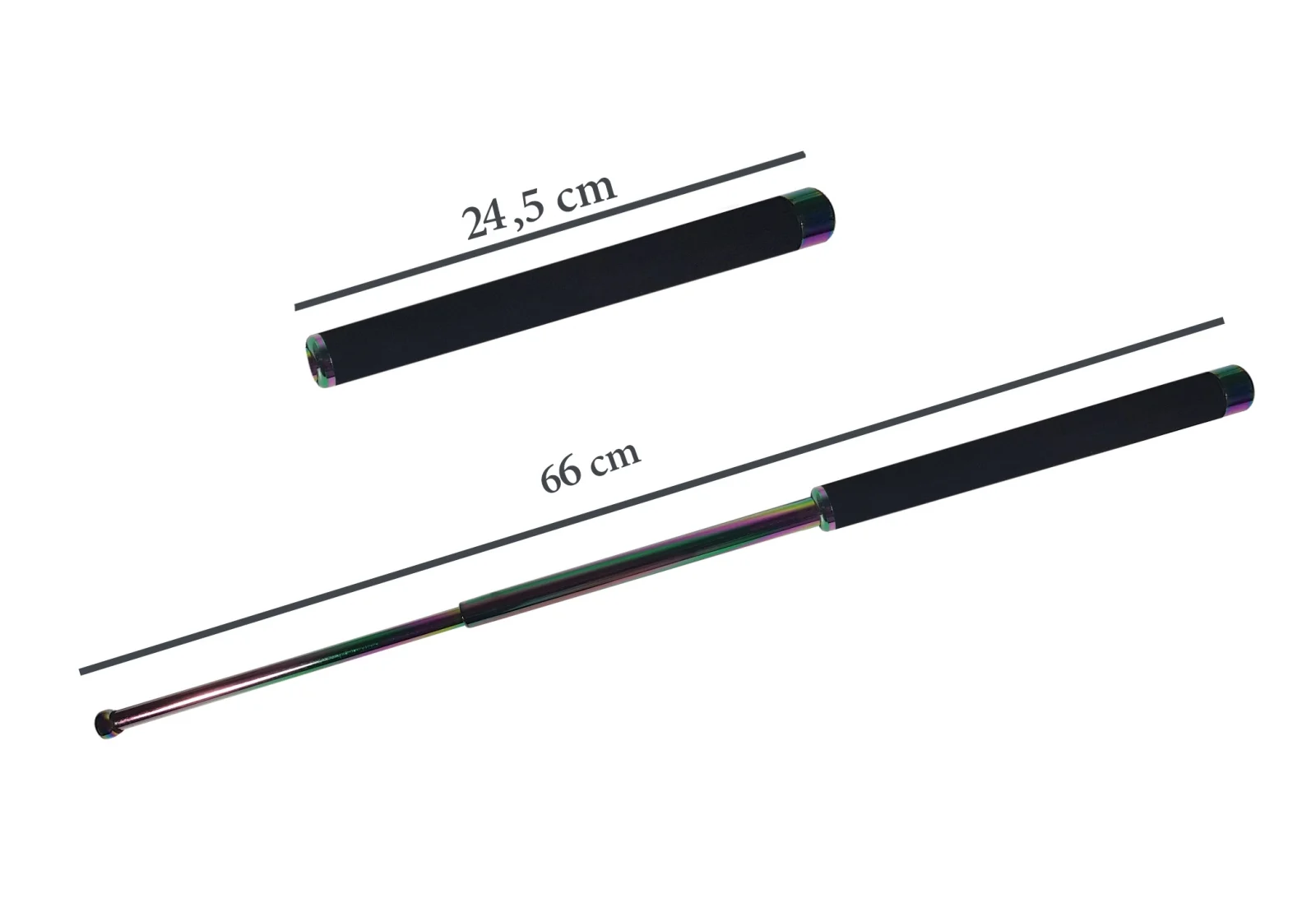 Baston telescopic pentru autoparare, alcatuit din patru elementi de otel, care se extind usor si se strang usor, cu sistem de inchidere magnetica.
