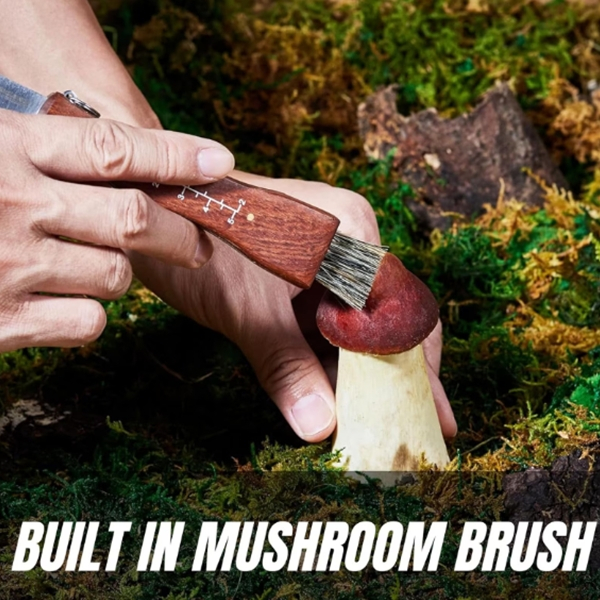 In partea din spate exista o perie pentru a ajuta la prima curatare a ciupercilor de pe pamant si a resturilor.
