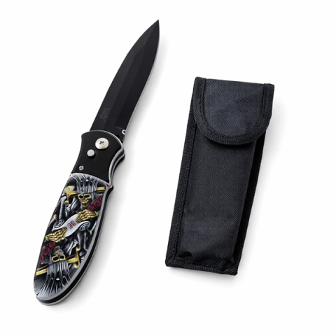 Acest set conține două cuțite automate compacte cu design artistic, potrivite pentru colecționari, utilizare EDC sau cadou original. Un model se remarcă prin lama cu finisaj multicolor tip rainbow și mâner decorat cu motive grafice detaliate, iar celălalt prezintă o lamă neagră elegantă și un mâner cu design artistic similar, pentru un aspect unitar și modern.