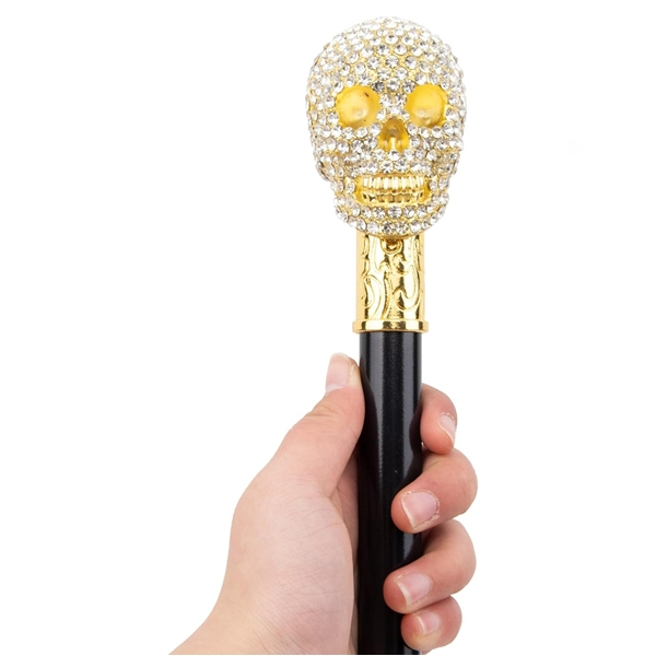 Mânerul în formă de craniu, decorat cu elemente strălucitoare tip cristale și finisaj auriu, oferă un look luxos și misterios. Detaliile atent lucrate conferă bastonului un aer extravagant și îl fac să iasă imediat în evidență.
