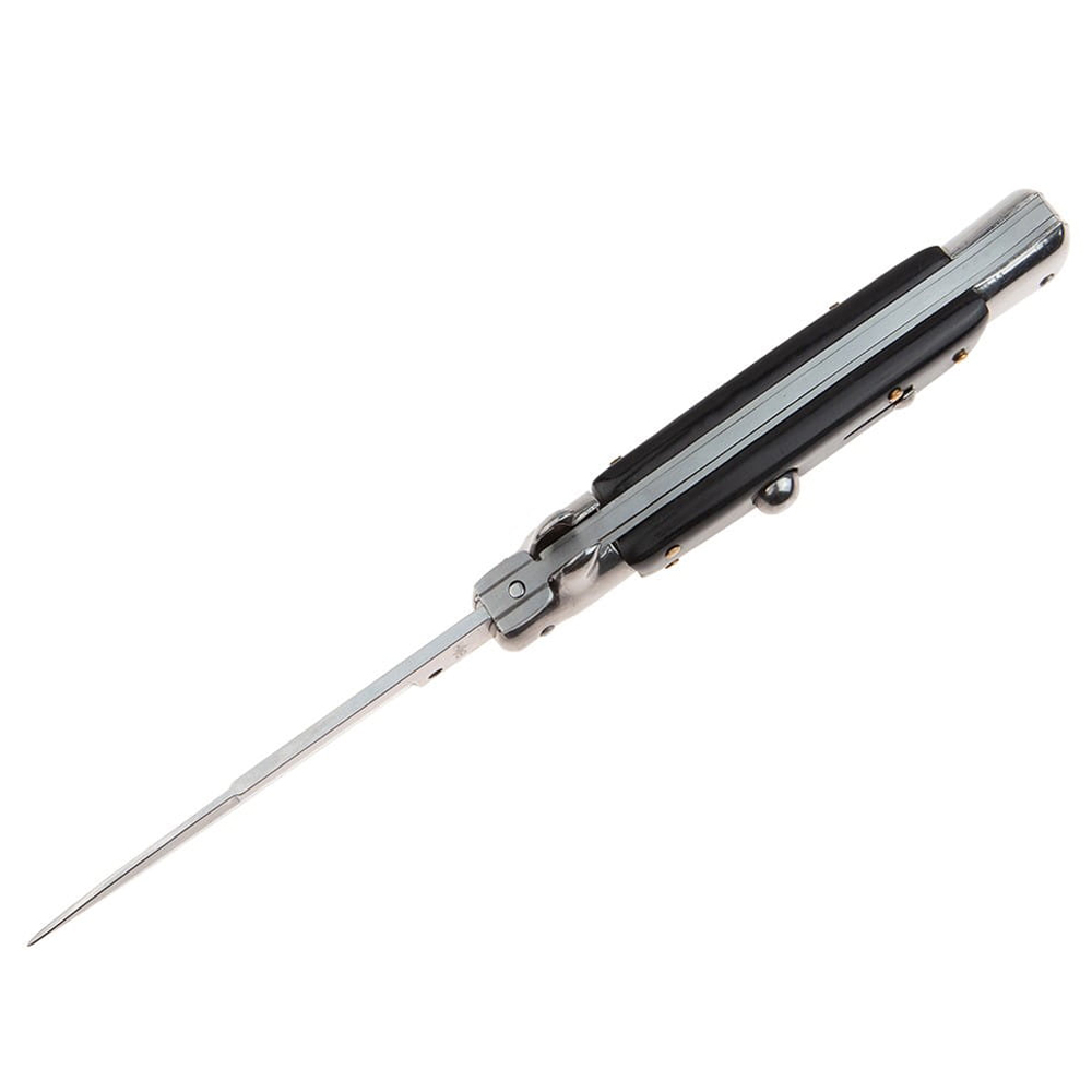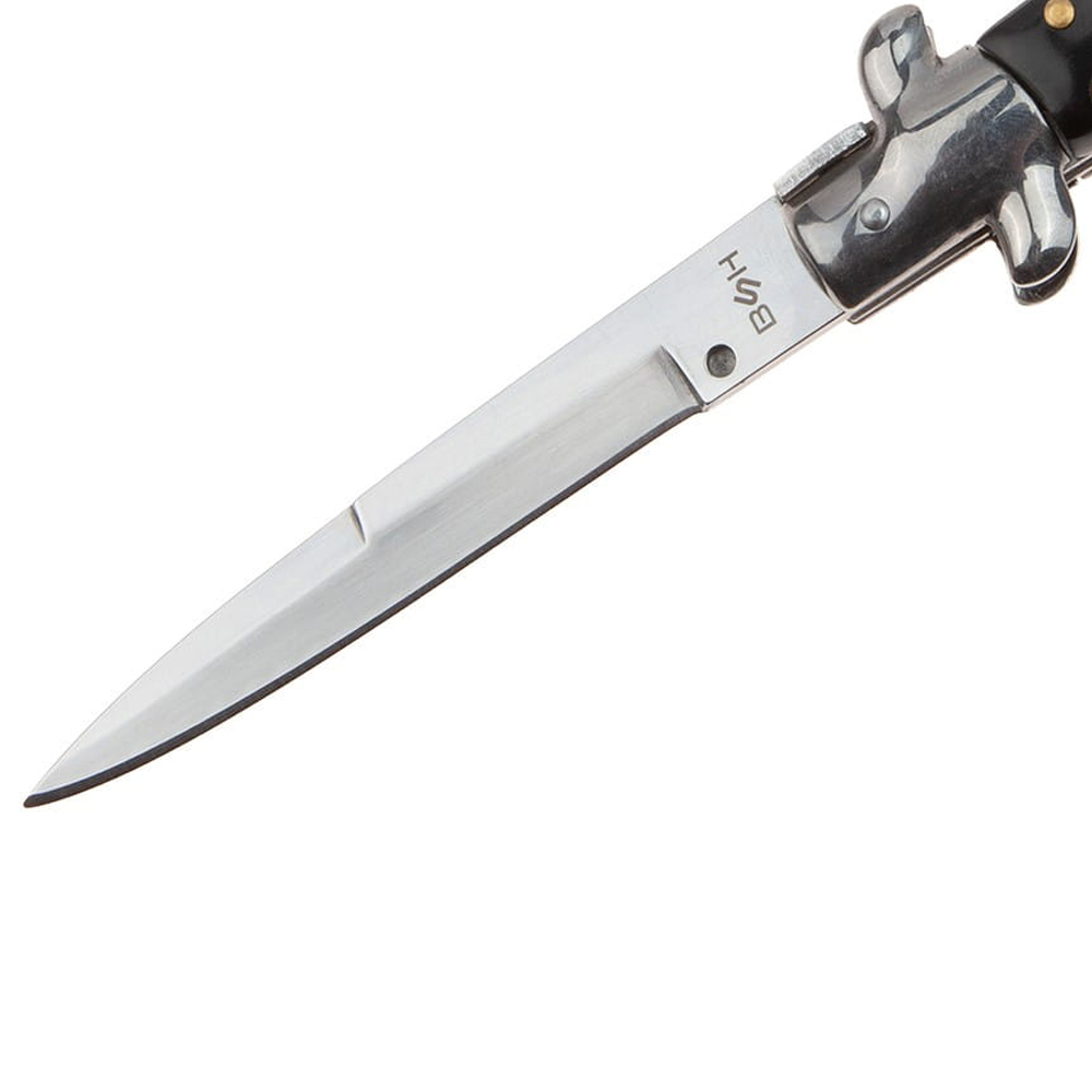 Mânerul este realizat din oțel cu căptușeli din lemn, oferind un aspect tradițional și un grip confortabil. Mecanismul cu arc este activat printr-un buton amplasat pe mâner, permițând o deschidere rapidă și eficientă.