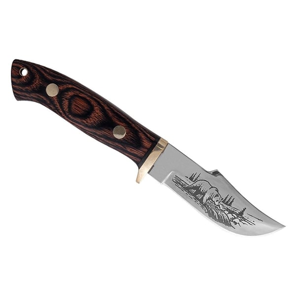 Lama cu profil Bowie, fabricata din otel inoxidabil 420, asigura performanta buna la taiere si o rezistenta sporita la coroziune. Designul este completat de gravura decorativa cu motiv de urs, aplicata pe ambele parti ale lamei, oferind un aspect distinct si autentic.