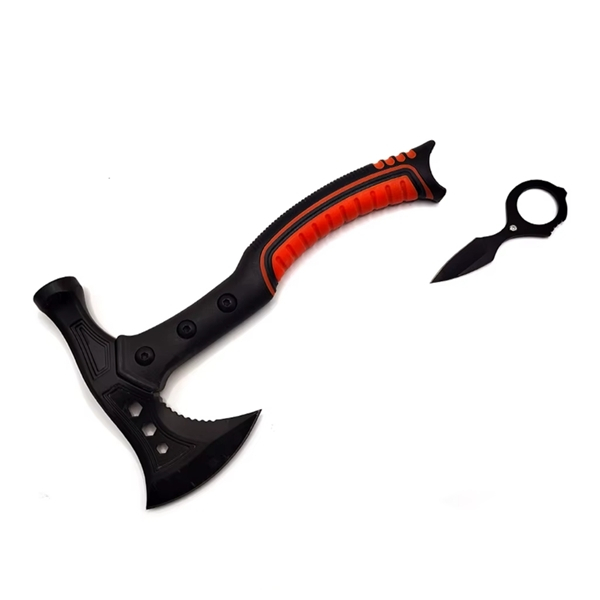 Topor multifunctional camping Tactical 33.5 cm cu lama dubla (topor + ciocan) si cutit Ninja de 12 cm integrat in maner. Fabricat din otel inoxidabil durabil, cu maner cauciucat antiderapant si fibra de nylon pentru siguranta si confort.