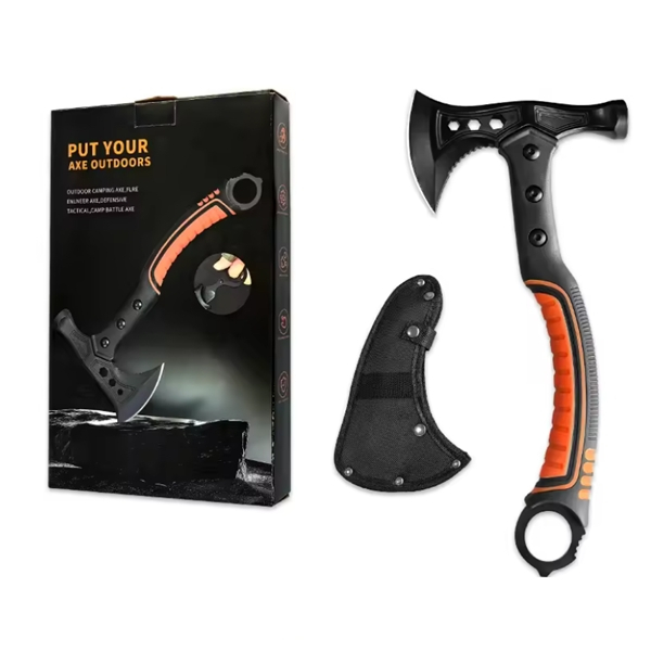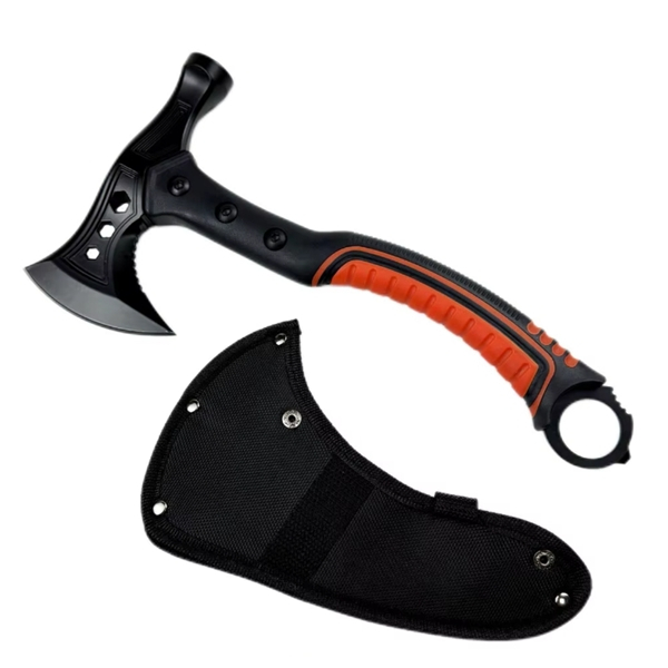 Topor multifunctional camping Tactical 33.5 cm cu lama dubla (topor + ciocan) si cutit Ninja de 12 cm integrat in maner. Fabricat din otel inoxidabil durabil, cu maner cauciucat antiderapant si fibra de nylon pentru siguranta si confort.